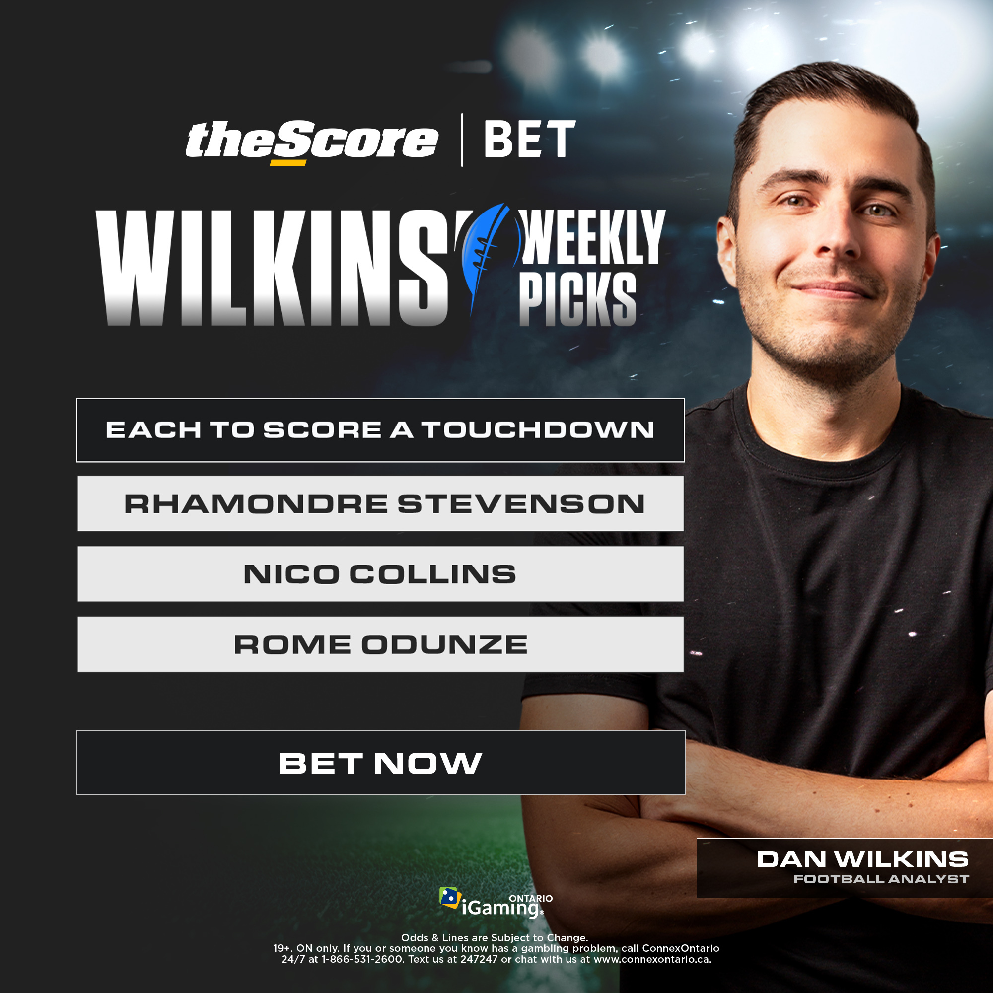 NFL analyst Dan Wilkins came up with his touchdown parlay of the day, targeting Stevenson, Nico Collins, and Rome Odunze all to find the end zone.